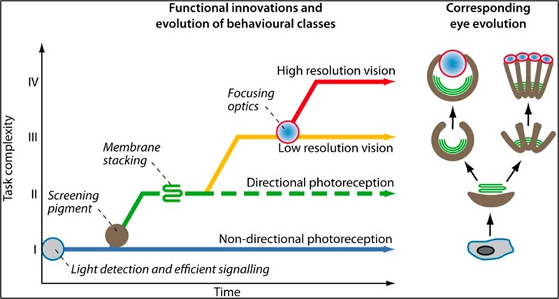 Las tareas de clase I pueden realizarse a intensidades inferiores a la luz de las estrellas con células sin ayuda y morfológicamente no especializadas. Las tareas de clase II también pueden ser realizadas por dichas células receptoras simples, pero solo hasta intensidades de medio crepúsculo. Para la operación a intensidades más bajas, es necesario introducir apilamiento de membranas, que es un prerrequisito para que las tareas de clase III funcionen incluso a intensidades de luz diurna. Para extender las tareas de clase III por debajo de las intensidades de medio crepúsculo, es necesario agregar óptica de enfoque. La visión de alta resolución requiere tanto apilamiento de membranas como óptica de enfoque para todas las intensidades, y las aperturas suficientemente grandes permiten la operación hasta intensidades nocturnas.